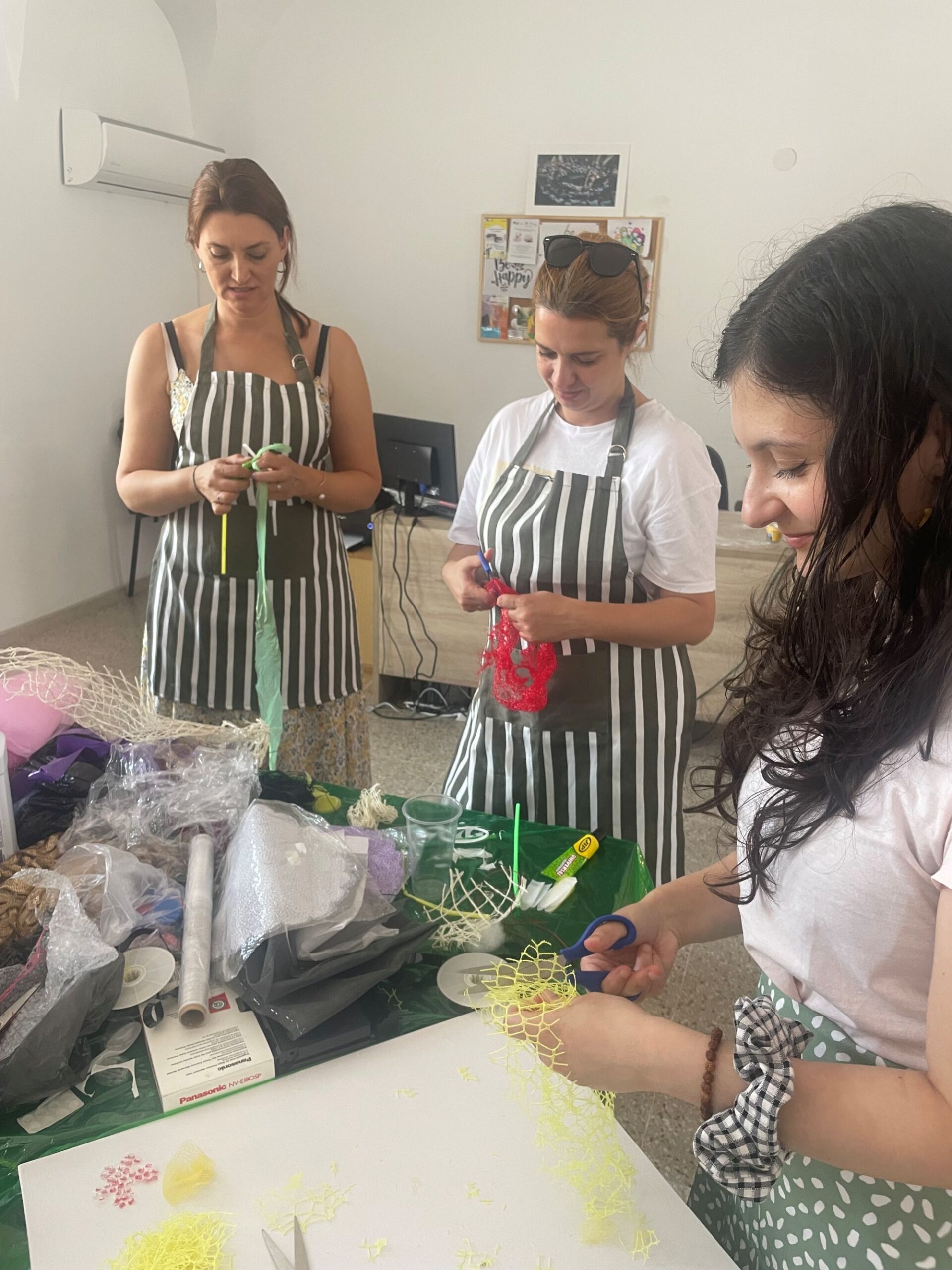 In Blagoevgrad, OECON BG organized five creative Saturdays at the Youth Center, led by artist and trainer Tsarimira Georgieva. The Labs introduced participants to sustainable artistic practices through hands-on techniques such as stone flower lace, plastic sculpture, and marbling, using recycled plastic, nylon, and other eco-friendly materials.